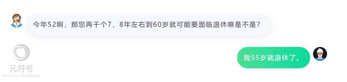 传统质检系统仅靠配置“退休”、“养老”这样的关键词或者表达式,无法从这样的对话中,正确推理出客户目前是52岁,要到55岁才能退休,因此目前处于未退休状态